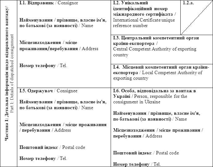 | Примiтки/Notes Вимоги цього мiжнародного сертифiката застосовуються до переробленого тваринного бiлка (крiм переробленого тваринного бiлка, що походить вiд вирощених на фермi комах), включаючи сумiшi та продукти (за винятком кормiв для домашнiх тварин), якi мiстять зазначений бiлок, не призначених для споживання людиною, що походять з країни чи її окремої територiї (зони або компартмента) та з потужностi, якi внесено до реєстру країн та потужностей, з яких дозволяється ввезення (пересилання) продуктiв на митну територiю України. / Requirements of this International Certificate apply to processed animal protein (other than processed animal protein derived from farmed insects) including mixtures and products (other than petfood) containing such protein, not intended for human consumption, originating from a country or a separate territory (zone or compartment) thereof and from an establishment listed in the register of countries and establishments authorised for the importation (sending) of products to the customs territory of Ukraine. Частина I/Part I: Пункт I.15: Вказати реєстрацiйний номер(и) залiзничних вагонiв або контейнерiв та автомобiлiв, назви кораблiв та номери рейсiв лiтакiв. Вiдправник зобов'язаний повiдомити вхiдний прикордонний iнспекцiйний пост в Українi у разi розвантаження або перезавантаження. / Box I.15: Indicate registration number (railway wagons or container and road vehicle), flight number (aircraft) or name (ship). In the event of unloading and reloading, consignor must inform entry BIP in Ukraine. Пункт I.19: Вказати вiдповiдний код УКТЗЕД: 0505, 0506, 0507, 0511, 2301 або 2309. / Box I.19: Use the appropriate HS code: 0505, 0506, 0507, 0511, 2301 or 2309. Пункт I.25: Технiчне використання: будь-яке використання для цiлей iнших, нiж годування сiльськогосподарських тварин, iнших нiж хутровi тварини, та виробництва кормiв для домашнiх тварин. / Box I.25: Technical use: any use other than feeding of farmed animals, other than fur animals and the production of petfood. Пункт I.28: Види: вибрати з наведеного: Aves (Птахи), Ruminantia (Жуйнi), Suidae (Свиневi), Mammalia (Ссавцi) iншi, нiж Ruminantia (Жуйнi) або Suidae (Свиневi), Pesca (Риба), Mollusca (Молюски), Crustacea (Ракоподiбнi), безхребетнi iншi, нiж Mollusca (Молюски) та Crustacea (Ракоподiбнi). У разi риби, вирощеної на фермi, зазначити наукову назву риби. / Box I.28: Species: select from the following: Aves, Ruminantia, Suidae, Mammalia other than Ruminantia or Suidae, Pesca, Mollusca, Crustacea, invertebrates other than Mollusca and Crustacea. In the case of farmed fish, specify the scientific name of the fish. Частина II: / Part II (1) Перероблений тваринний бiлок, не призначений для споживання людиною, - тваринний бiлок, який пiддано переробцi з метою безпосереднього застосування як кормового матерiалу або для будь-якого iншого використання в кормах, включаючи корми для домашнiх тварин, або для використання в органiчних добривах чи покращувачах ґрунту. Цей термiн не включає продукти кровi, молоко, продукти на основi молока, продукти, отриманi з молока, молозиво, продукти на основi молозива, шлам iз центрифуги або сепаратора, желатин, гiдролiзований бiлок i двокальцiйфосфат, яйця та яйцепродукти, включаючи яєчнi шкаралупи, трикальцiйфосфат i колаген. / Processed animal protein not intended for human consumption - animal protein, which was processed for the purpose of direct use as feed material or for any other use in feedingstuffs, including petfood, or for use in organic fertilisers or soil improvers. This term does not include blood products, milk, milk-based products, milk-derived products, colostrum, colostrum products, centrifuge or separator sludge, gelatine, hydrolysed proteins and dicalcium phosphate, eggs and egg-products, including eggshells, tricalcium phosphate and collagen. (2) Видалити у разi необхiдностi. / Delete as appropriate. (3) Де: / Where: