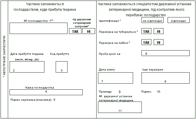 ** Нумерацiя полiв (зон) ветеринарної картки (цифри 1 - 11 на бланку не друкуються):