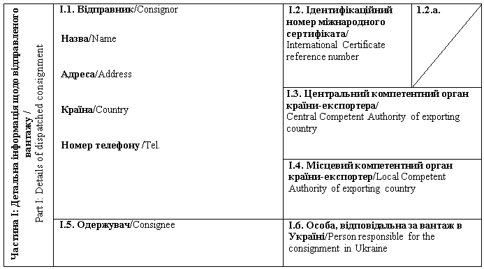 | Примiтки/Notes Вимоги цього мiжнародного сертифiката застосовуються до меду та iнших продуктiв бджiльництва, призначених для споживання людиною, що походять з країни чи її окремої територiї (зони або компартмента) та з потужностi, якi внесено до реєстру країн та потужностей, з яких дозволяється ввезення (пересилання) продуктiв на митну територiю України/ Requirements of this International Certificate apply to honey and other apiculture products, intended for human consumption, originating from a country or a separate territory (zone or compartment) thereof and from an establishment listed in the register of countries and establishments authorised for the importation (sending) of products to the customs territory of Ukraine. Частина I/Part I: Пункт I.11: Вказати назву, адресу та номер затвердження потужностi, що виданий компетентним органом / Box I.11: Indicate name, address and approval number of establishment, issued by competent authority. Пункт I.15: Вказати реєстрацiйний номер(и) залiзничних вагонiв або контейнерiв та автомобiлiв, назви кораблiв та номери рейсiв лiтакiв. Окремо надається iнформацiя у разi розвантаження або перезавантаження/ Box I.15: Indicate registration number (railway wagons or container and road vehicle), flight number (aircraft) or name (ship). Separate information is to be provided in the event of unloading and reloading. Пункт I.19: Вказати код вантажу