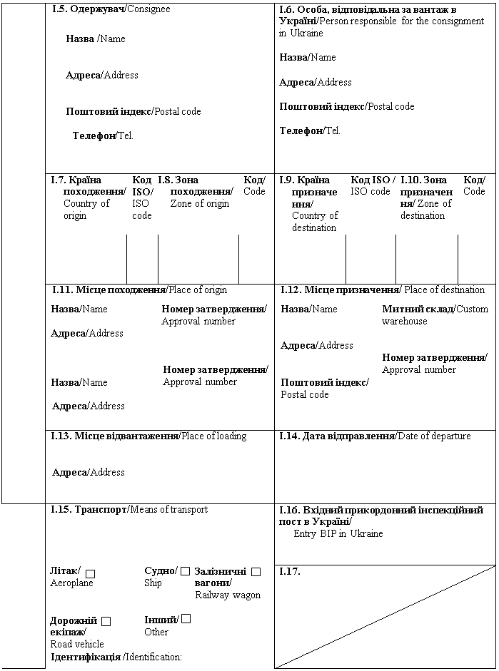 | Частина I/Part I: Пункт I.15: Вказати реєстрацiйний номер(и) залiзничних вагонiв або контейнерiв та автомобiлiв, назви кораблiв та номери рейсiв лiтакiв. Вiдправник зобов'язаний повiдомити вхiдний прикордонний iнспекцiйний пост в Українi у разi розвантаження або перезавантаження / Box I.15: Indicate registration number (railway wagons or container and road vehicle), flight number (aircraft) or name (ship). In the event of unloading and reloading, consignor must inform entry BIP in Ukraine. Пункт I.19: Вказати код вантажу (УКТЗЕД) / Box I.19: Indicate commodity code (HS code). Частина II: / Part II: (1) Колiр пiдпису та печатки має вiдрiзнятися вiд кольору iншого тексту / The signature and the seal must be in a different colour that of the text. |
