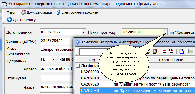 В программе есть опция оформления электронной декларации гуманитарной помощи. Заполнение декларации в программе не вызывает особых сложностей. Электронная декларация отправляется на таможню через web-сервис и ответ от таможни Вы получаете в реальном времени :